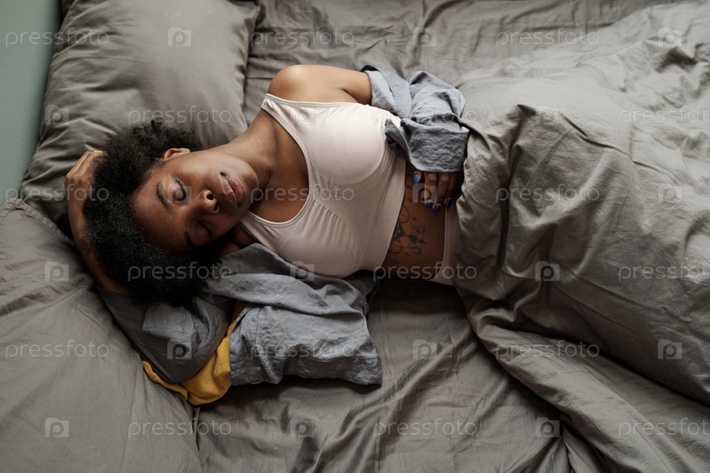 Молодая усталая женщина спит под серым одеялом
