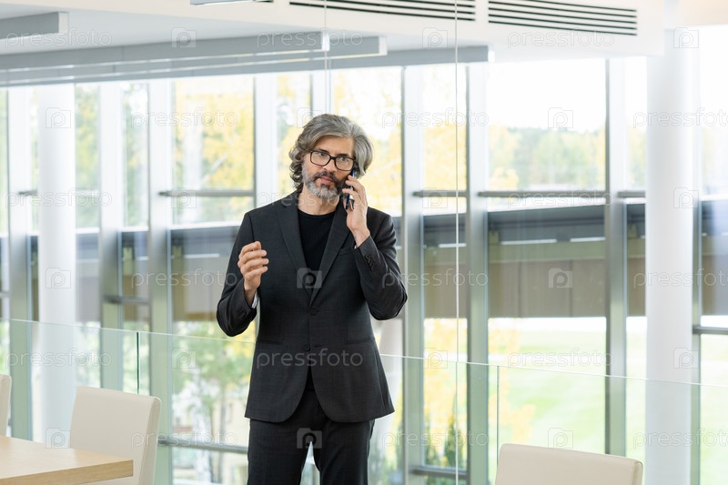 Серьезный бизнесмен в очках и формальной одежде консультирует клиента по телефону
