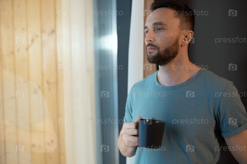 Молодой мыслящий и расслабленный мужчина в серой футболке держит кружку с горячим чаем или кофе