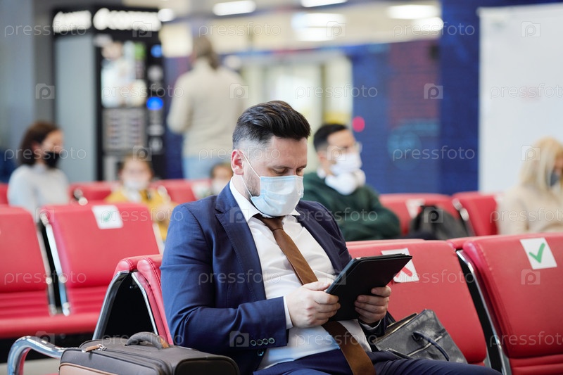 Бизнесмен с планшетным компьютером в аэропорту
