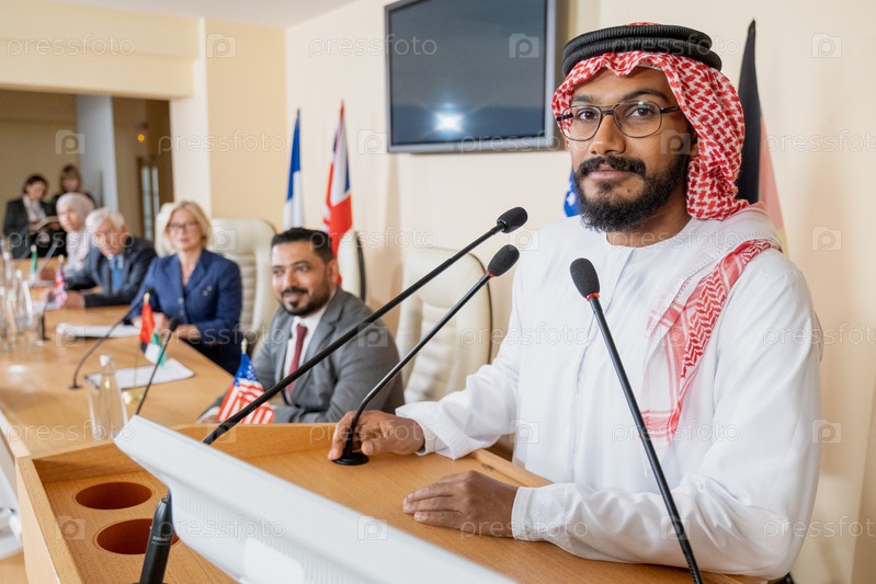 Молодой арабский оратор смотрит на камеру, стоя у трибуны