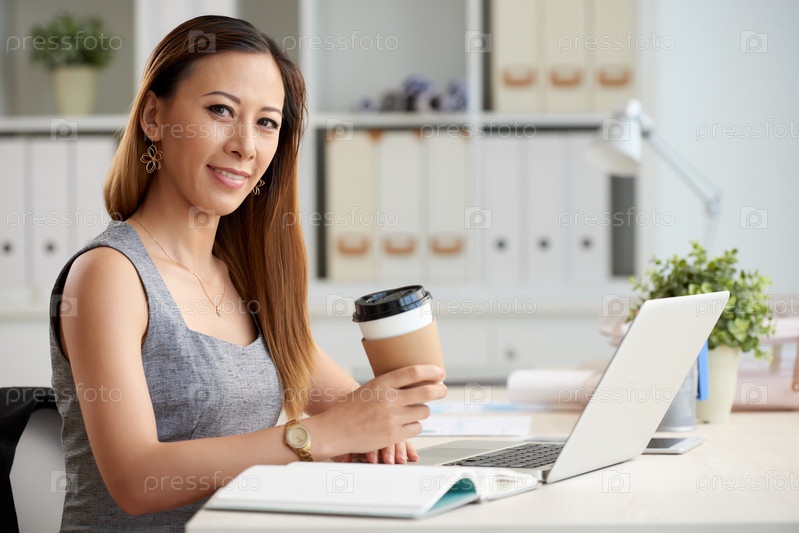 Азиатская женщина с кофе на вынос в офисе
