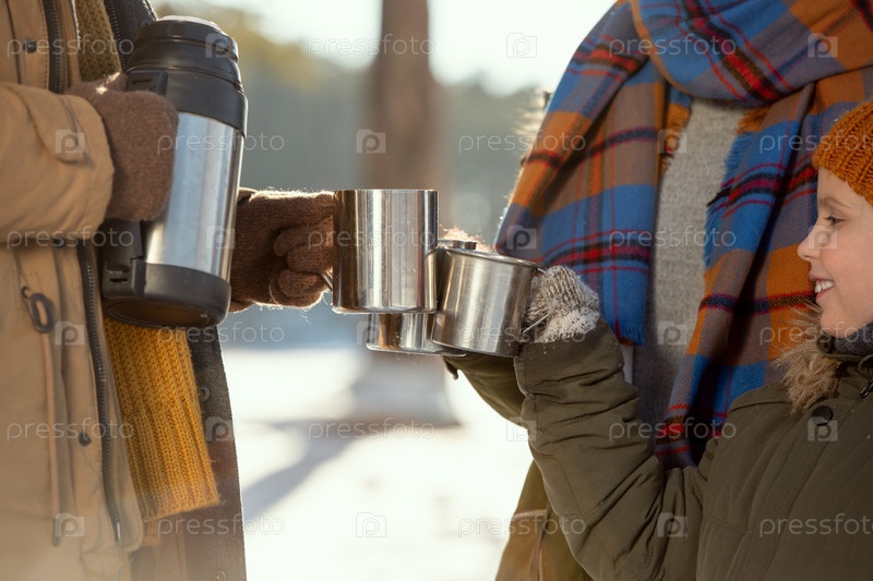 Счастливая маленькая девочка и ее родители в теплых зимних одеждах звучат с металлическими кружками