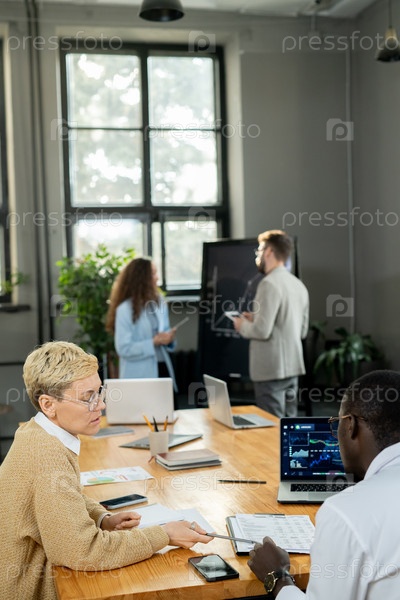 Молодая экономистка-женщина представляет финансовые данные коллеге
