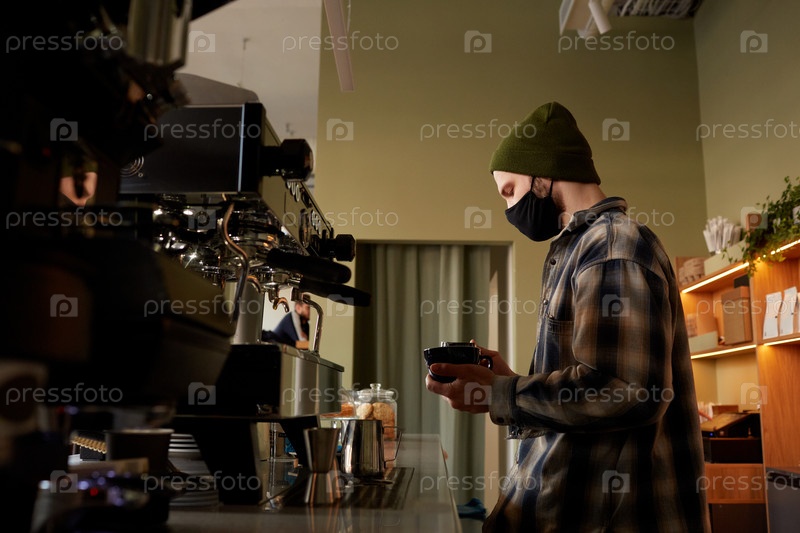 Бариста, носящая маску в кафе Side View