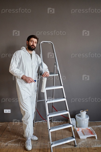 Вертикальный снимок мужчины в защитном костюме, выполняющего ремонтные работы в своей квартире и смотрящего на камеру