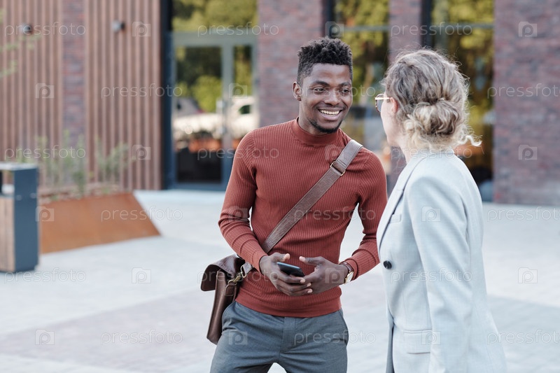 Улыбающийся африканский бизнесмен разговаривает с коллегой