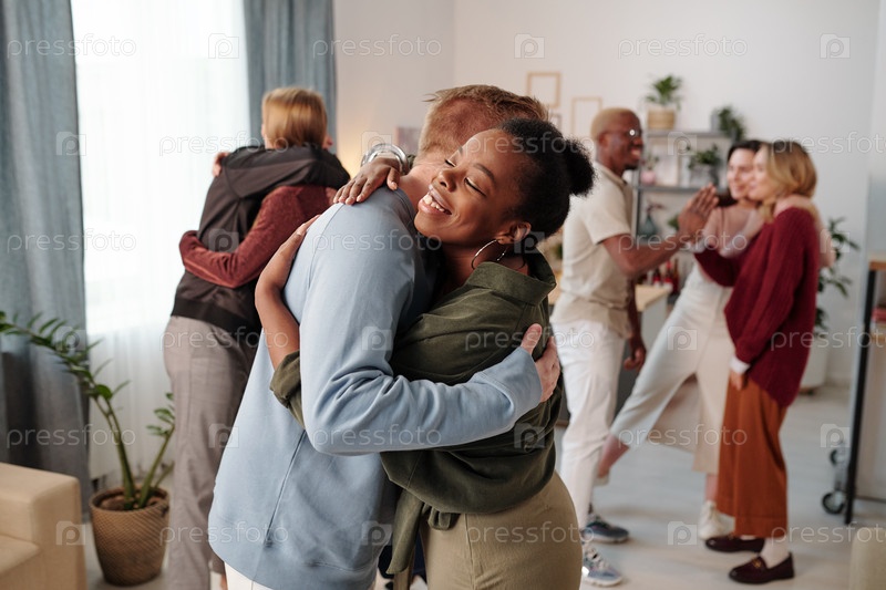 Счастливая молодая африканская женщина в умной повседневной одежде обнимает парня в синем пуловере