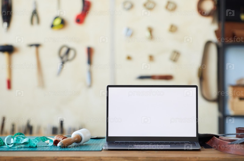 Ноутбук в мастерской на заднем плане
