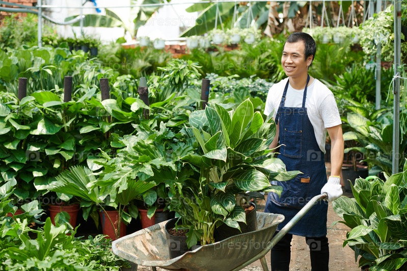 Работник толкает тележку с растениями
