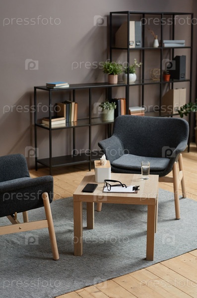 Вертикальный безлюдный снимок современного интерьера офиса психолога в сером и коричневом цветах с двумя стульями и кофейным столом