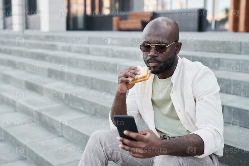 Городской мужчина ест бутерброд на свежем воздухе