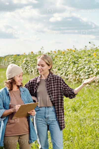 Два веселых фермера в рабочей одежде смотрят на поле подсолнечника перед камерой