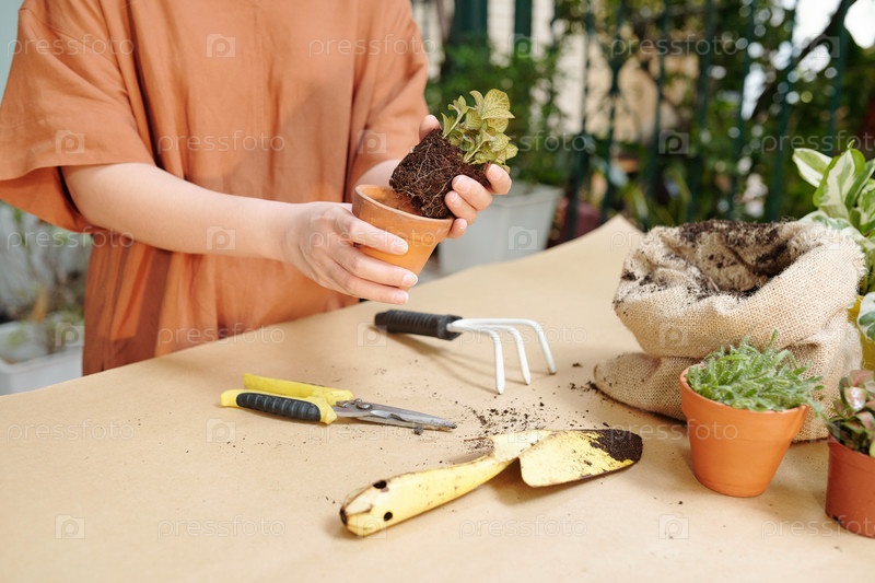 Женщина сажает цветы в горшки