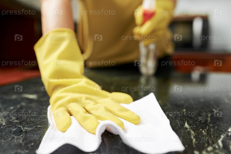 Домашняя хозяйка убирает кухонный стол