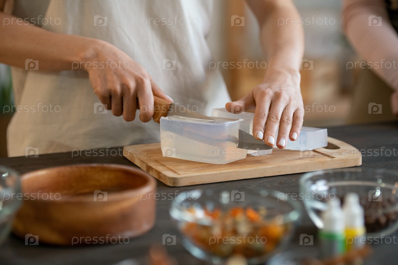 Руки женщины, стоящей за столом и режущей твердую мыльную массу на деревянной доске