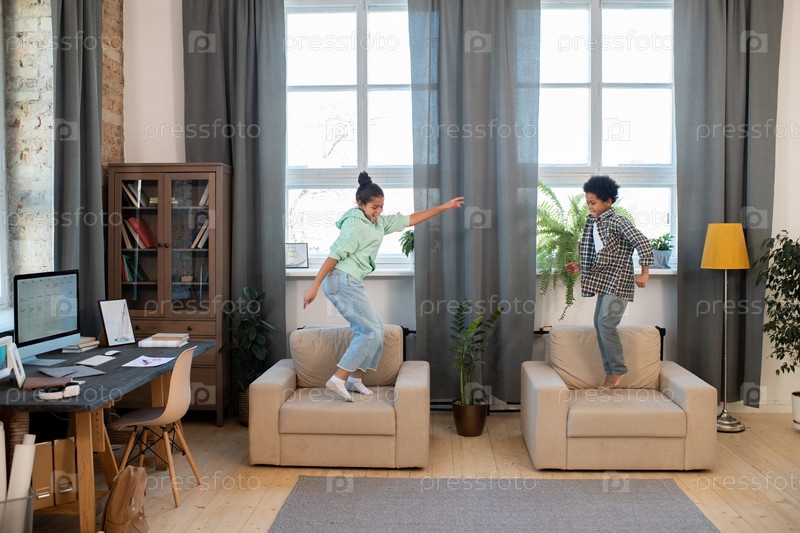 Двое милых братьев и сестер смешанной расы в повседневной одежде прыгают и танцуют на мягких креслах