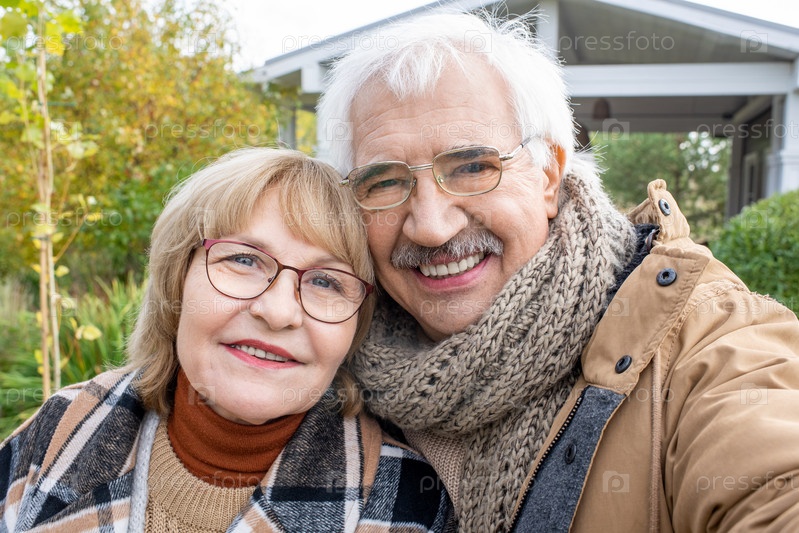 Веселая старшая пара в стильной теплой повседневной одежде смотрит на вас с улыбкой