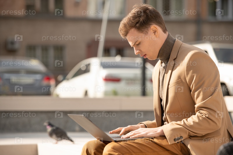 Молодой серьезный бизнесмен в умной повседневной одежде, использующий ноутбук в городской среде