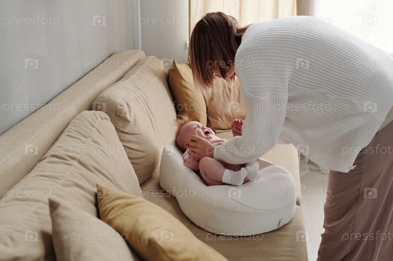 Молодая женщина наклоняется над диваном со своей милой плачущей дочерью