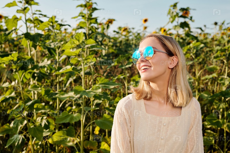 Лицо улыбающейся молодой блондинки в солнцезащитных очках, стоящей напротив подсолнечника