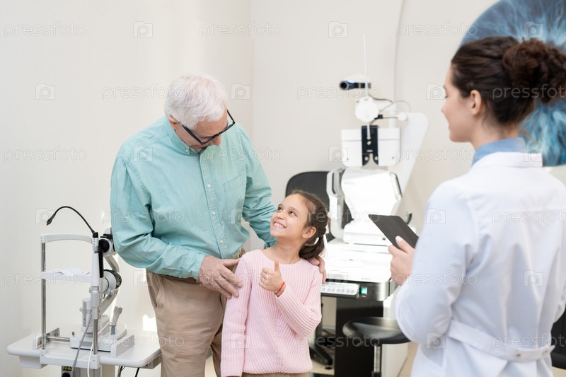Пожилой мужчина со своей счастливой внучкой, стоящей перед офтальмологом