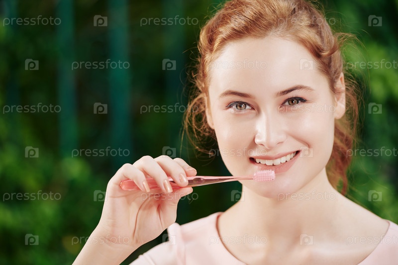 Улыбающаяся женщина чистит зубы