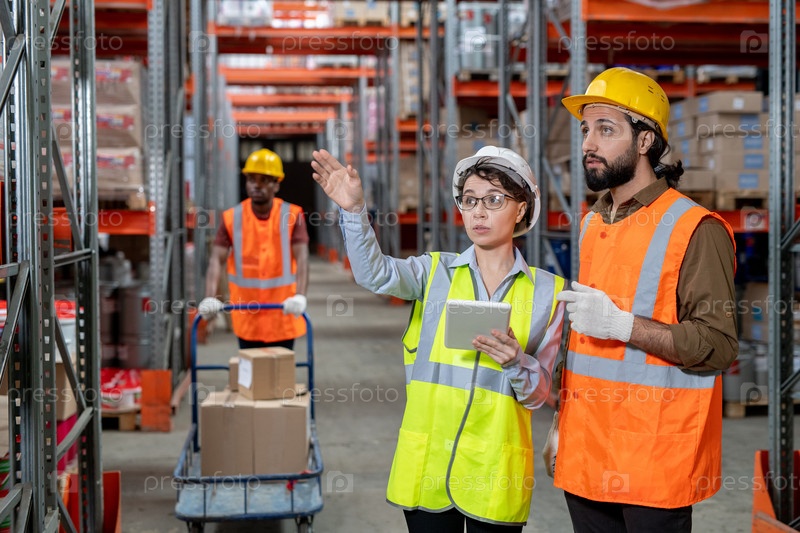 Молодой складский персонал обсуждает размещение товаров