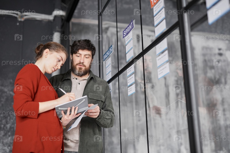 Два бизнес-люда планируют проект по стеклянной стене