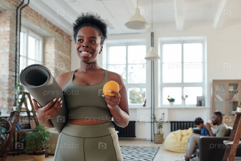 Здоровая молодая африканская спортсменка с зубчатой улыбкой, держащая коврик и свежий апельсин