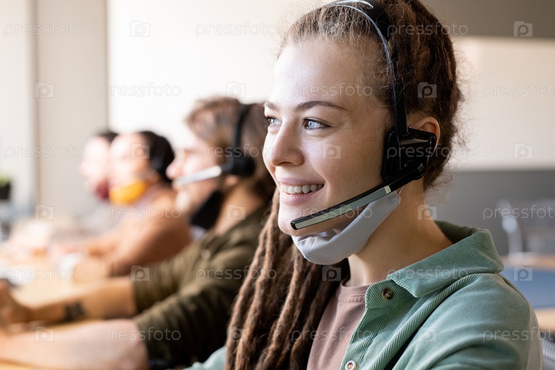 Ряд представителей службы поддержки клиентов с гарнитурами, работающих в колл-центре