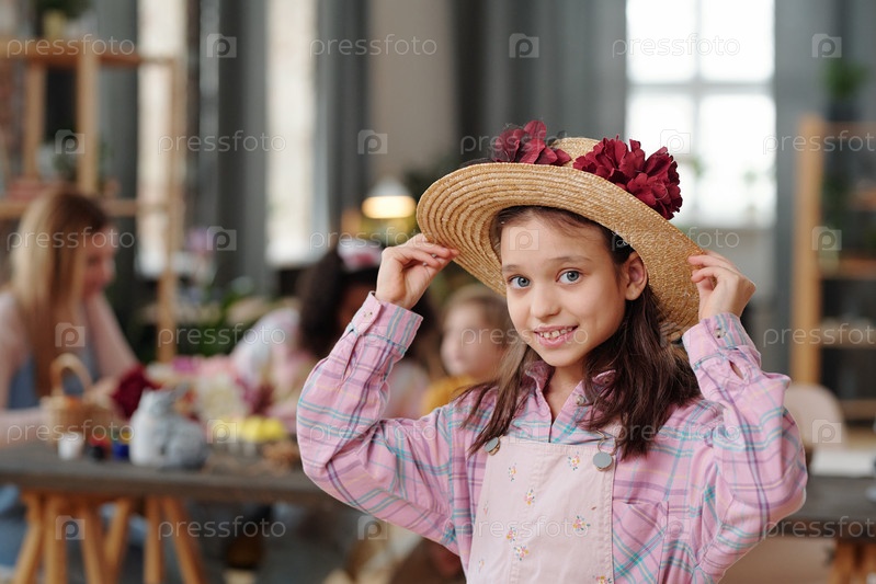 Маленькая девочка в шляпе, украшенная большими ручными пурпурными цветами, смотрит на тебя