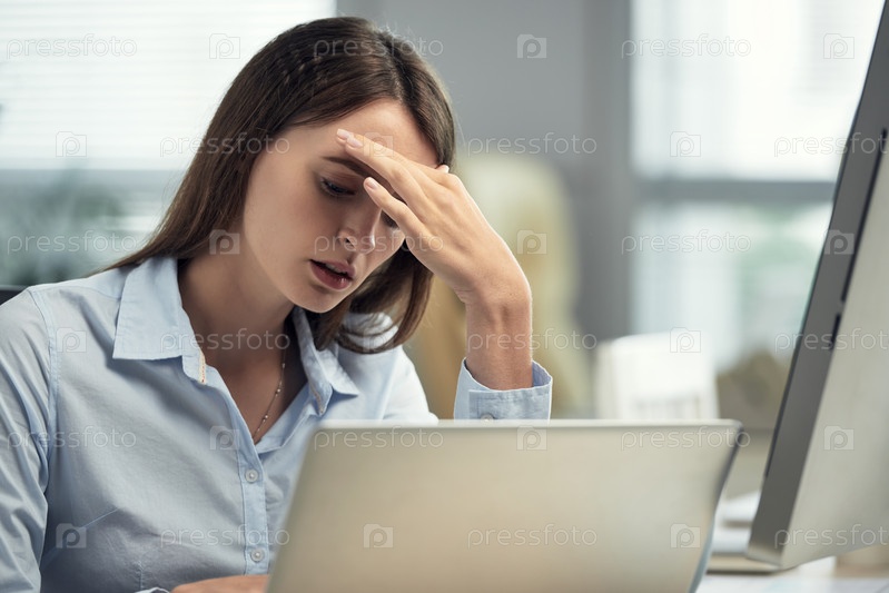 Женщина с головной болью, работающая в офисе
