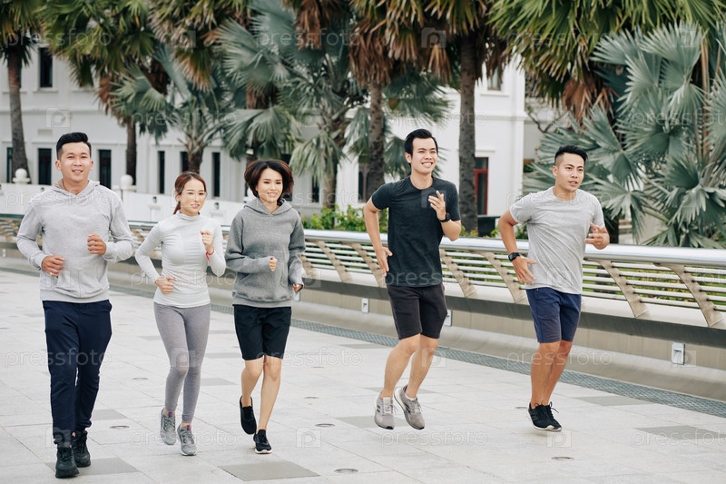 Фитнес азиатские друзья бегают вместе