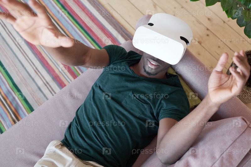 Мужчина, использующий VR-очки и гарнитуру лежа на диване