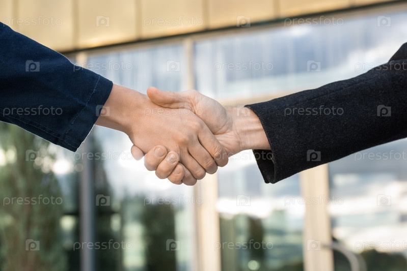 Пожимание рук успешных деловых партнеров против экстерьера современного здания