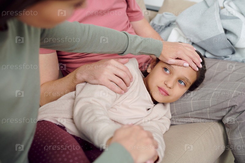 Рука молодой бережной женщины, заботящейся о своей больной милой дочери
