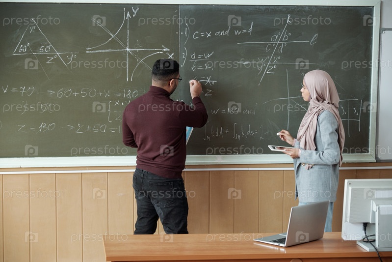 Профессор-мужчина и молодая студентка стоят у доски и решают уравнение на уроке
