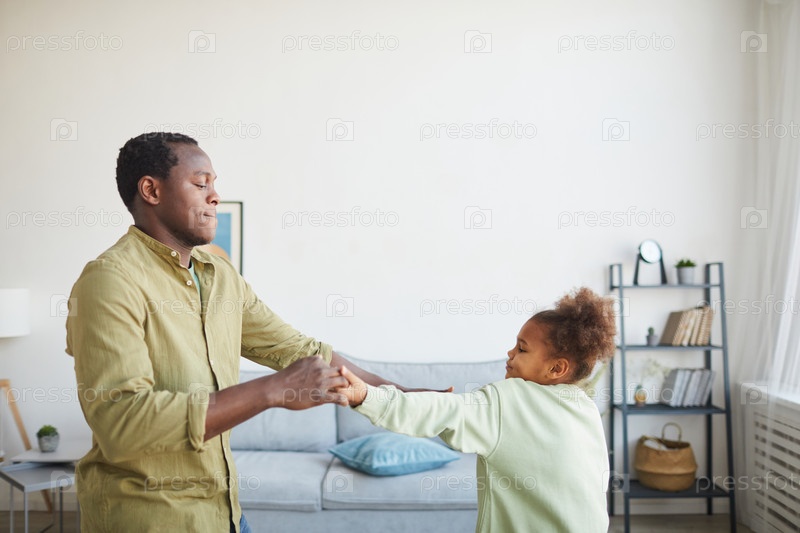 Беспечный афроамериканский мужчина танцует с дочерью дома
