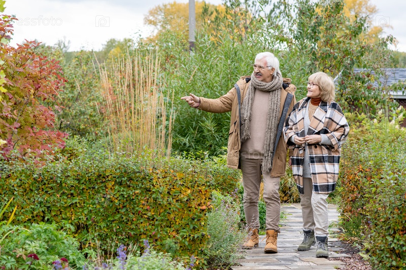 Счастливая старшая пара в теплых повседневных одеждах движется по узкой дороге в саду
