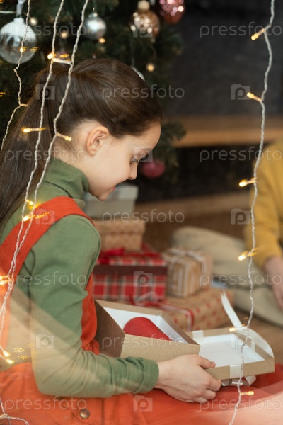 Девушка, которая смотрит на свое настоящее в коробке