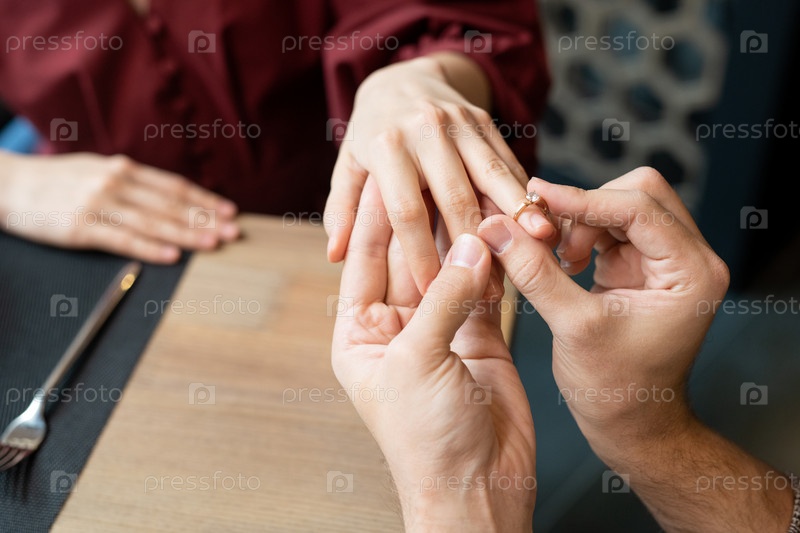 Руки молодого человека, надевающего обручальное кольцо на палец своей девушки к ужину