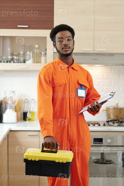 Портрет бородатого сантехника в оранжевой рабочей одежде