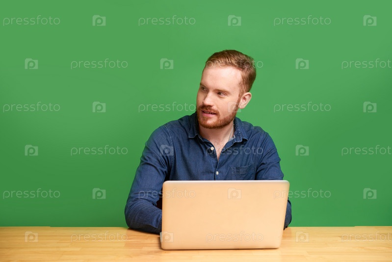 Молодой человек с ноутбуком изолирован на зеленом фоне
