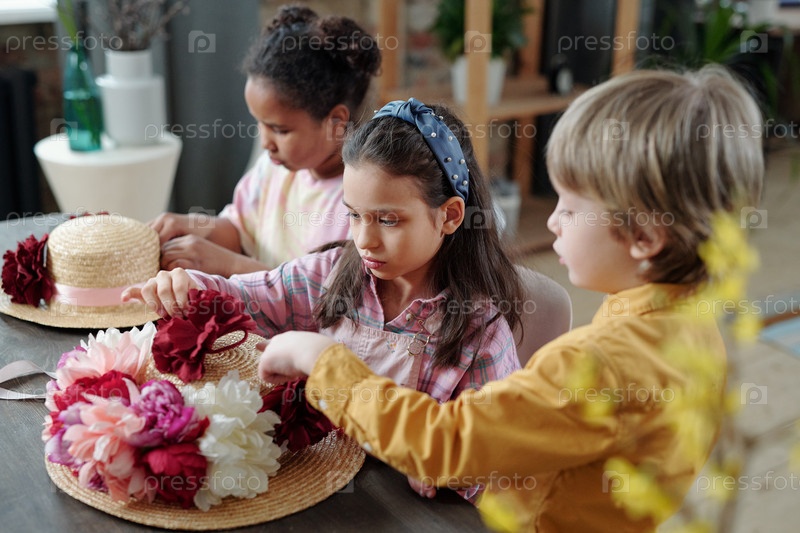 Группа детей кладет ручные цветы белого, розового и пурпурного цвета на шляпу