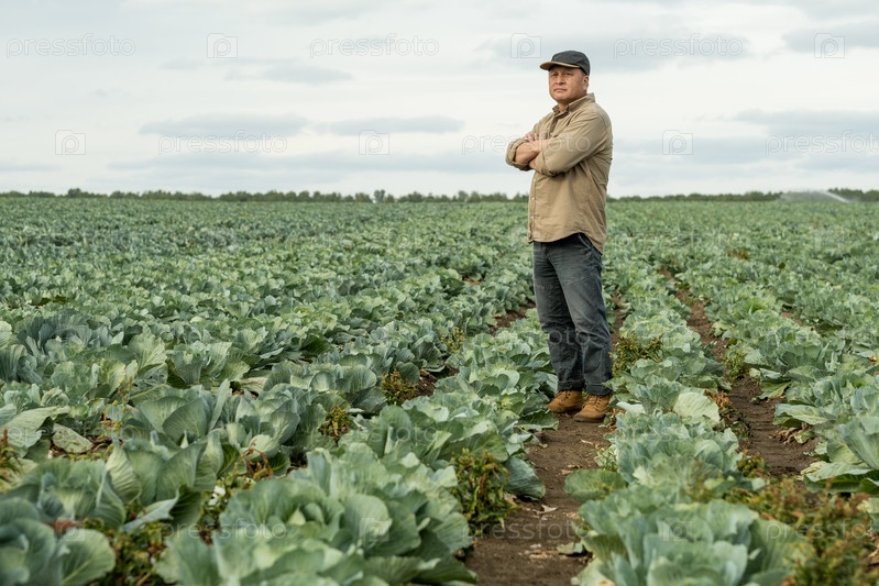 Зрелый фермер стоит в переулке между выращиванием капусты