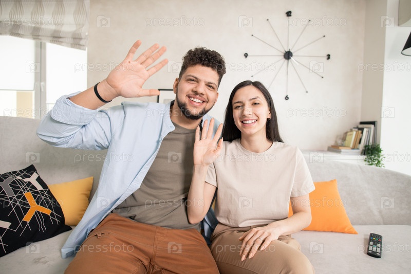 Молодая веселая пара смотрит на вас с зубчатой улыбкой и машет руками, сидя на диване