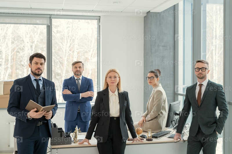 Уверенные коллеги по бизнесу позируют за офисным столом