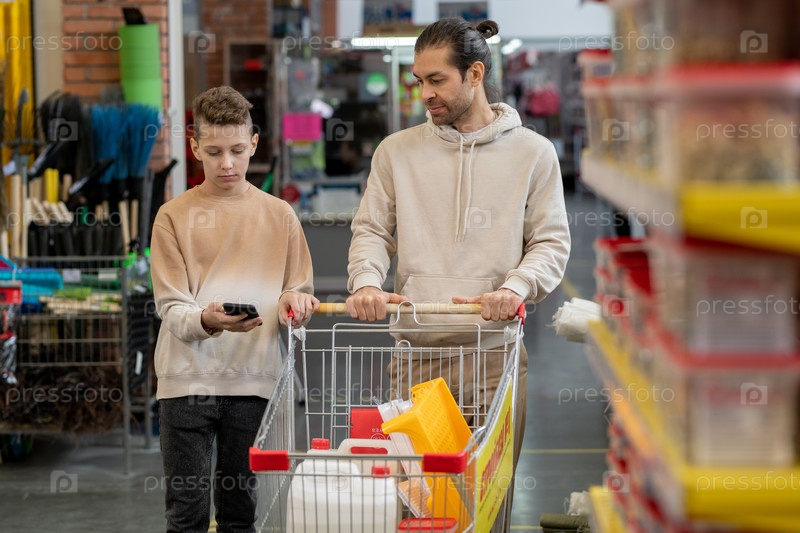 Мужчина толкает тележку и смотрит на экран смартфона, который держит его сын