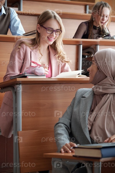 Счастливая блондинка в умной повседневной одежде и очках смотрит на своего товарища по группе с хиджабом на лекции